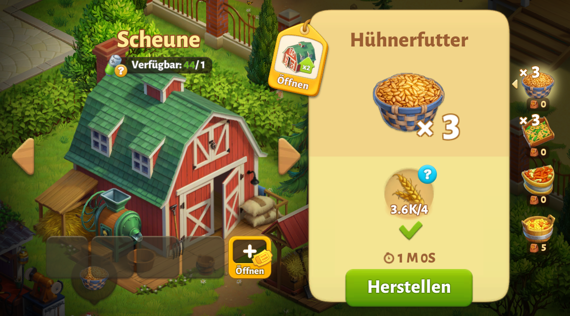Sie benötigen die Zutaten, um die Produktion starten zu können. Die erforderlichen Zutaten für jedes Rezept sind auf der rechten Seite des Bildschirms angezeigt.