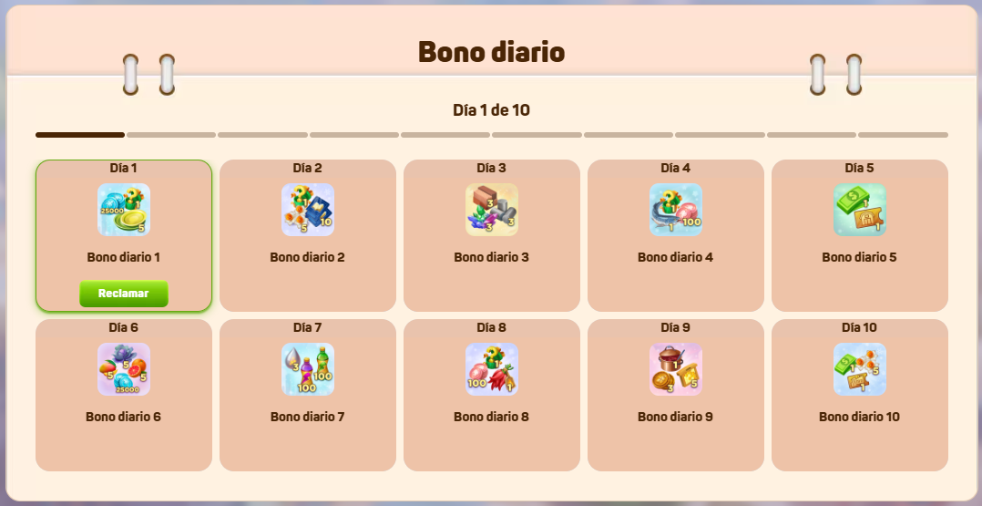 Bono diario: ¡Visita la Tienda Online y reclama tu recompensa durante 10 días consecutivos sin saltarte ninguno! Una vez que recojas la recompensa final del décimo día, el ciclo se reinicia, lo que te permite seguir ganando bonificaciones.