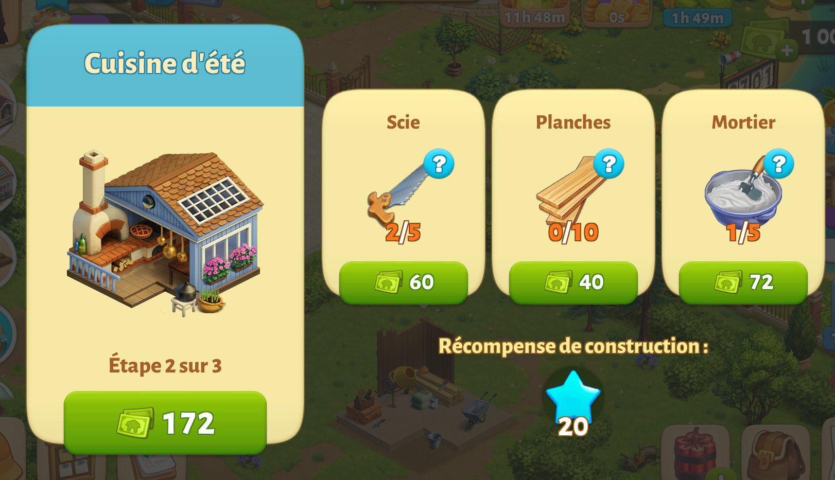 Chaque bâtiment est livré avec 2 emplacements de production. Vous pouvez acheter 2 emplacements supplémentaires pour un total de 4. Choisissez la recette que vous souhaitez produire en glissant de haut en bas entre les différentes recettes. Une fois que vous avez choisi la recette, faites-la simplement glisser vers le bâtiment ou utilisez le bouton "Démarrer". Vous devez avoir les ingrédients nécessaires pour pouvoir démarrer la production. Les ingrédients nécessaires pour chaque recette se trouvent sur le côté gauche de l'écran.