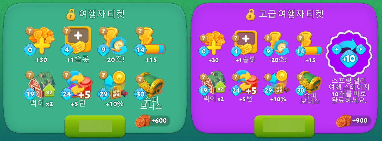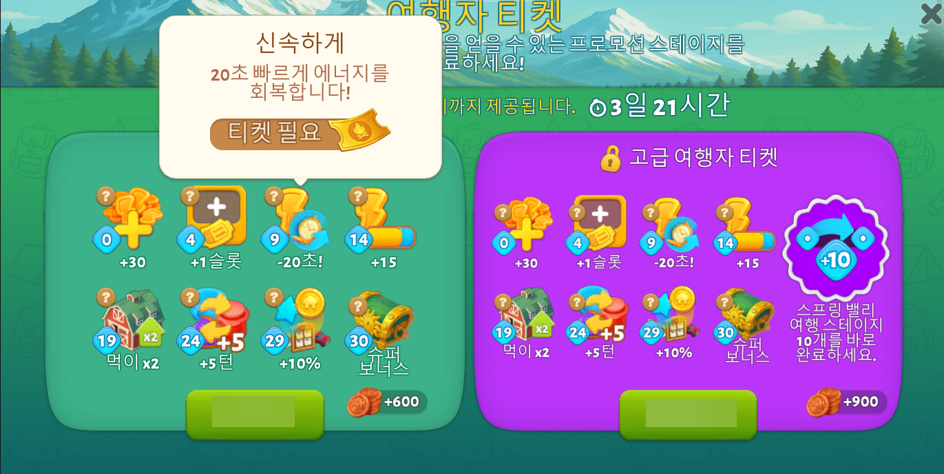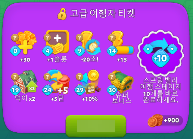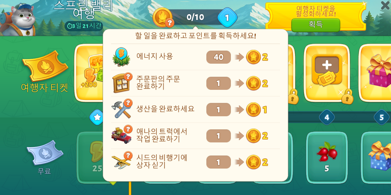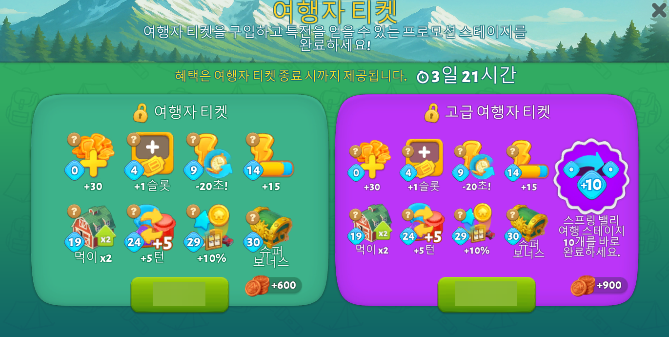 하단 행의 보상은 특별 밸리 패스 티켓을 활성화했는지 여부와 관계없이 임무를 완료하면 언제든지 획득할 수 있습니다: