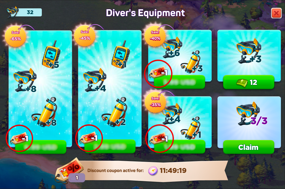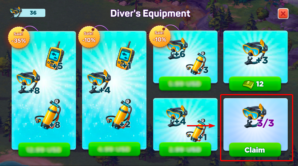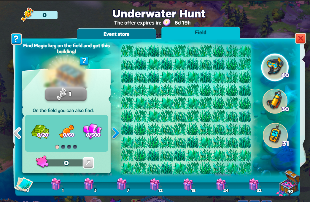 Подводная охота — это 6-дневное событие для игроков уровня 15 и выше. На игровом поле вы увидите множество закрытых клеток. Используйте инструменты (Маску для снорклинга или Акваланг), чтобы открывать их. Каждая клетка скрывает награду — монеты, призы или иногда специальные предметы. Копая, вы собираете Монеты исследователя, которые можно потратить в магазине события на полезные предметы и здания. Главная цель — найти Магические ключи, спрятанные на поле, и обменять их на большие награды. После окончания события магазин остается открытым еще 2 дня, чтобы вы могли потратить свои монеты.
