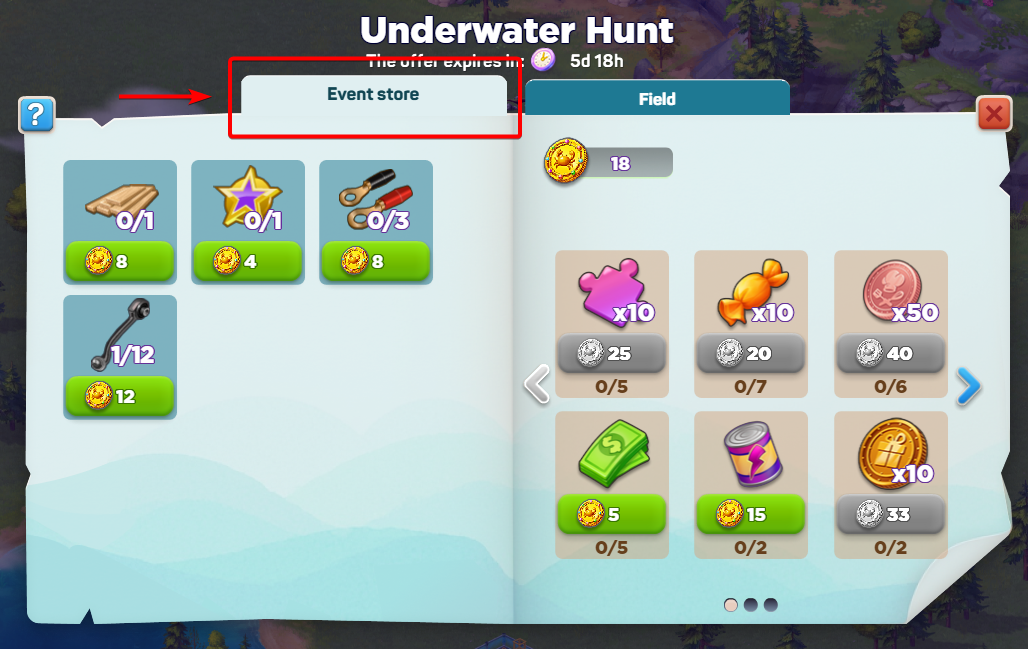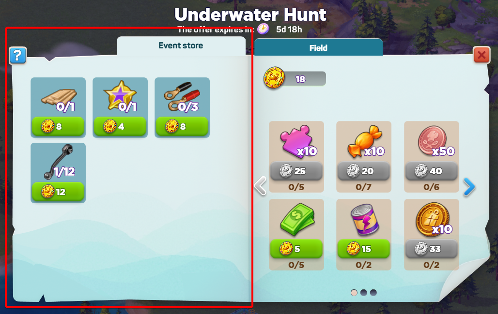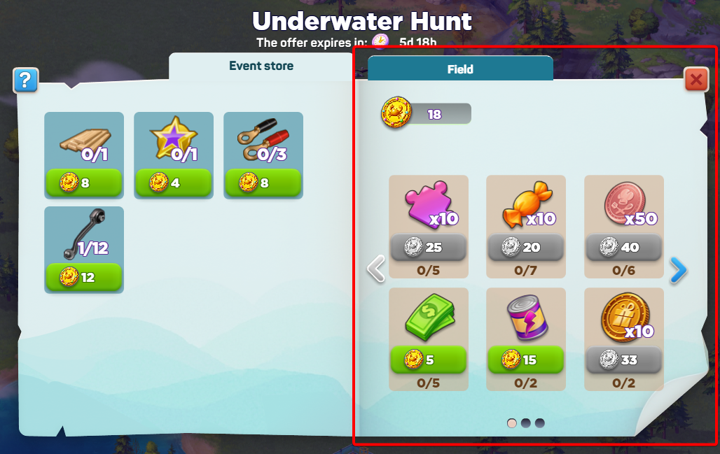 - Магазин события: магазин для Монет исследователя. Слева показаны предметы, необходимые для текущих квестов; справа — другие награды. После окончания события магазин остается открытым еще 2 дня; затем оставшиеся монеты автоматически превращаются в полезные предметы.