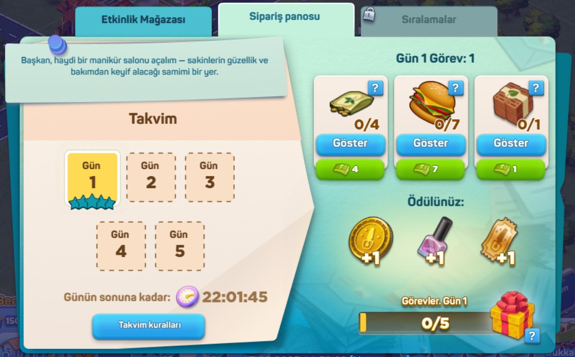 Her gün 5 görevi tamamlamanız gerekiyor (görevler oyunculara rastgele verilir). Görevleri tamamlayarak aşağıdaki eşyaları alırsınız