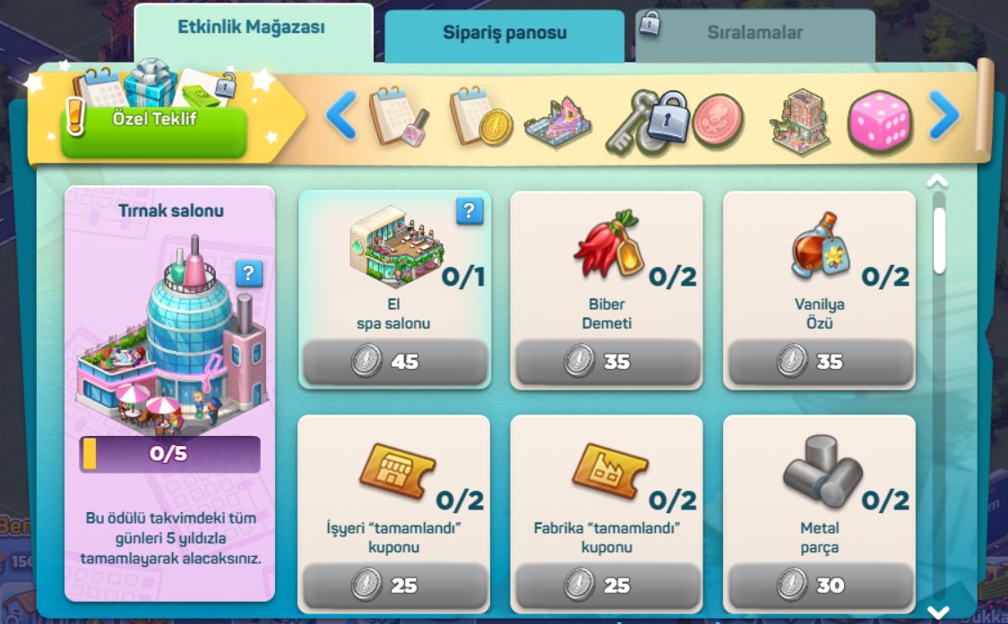 Etkinlik mağazası sekmesini etkinlikte kullanabilirsiniz. Etkinlik madeni paraları karşılığında çeşitli binaları ve faydalı eşyaları buradan satın alabilirsiniz. Etkinliğin aktif kısmı biter bitmez mağaza 3 gün daha çalışacak.