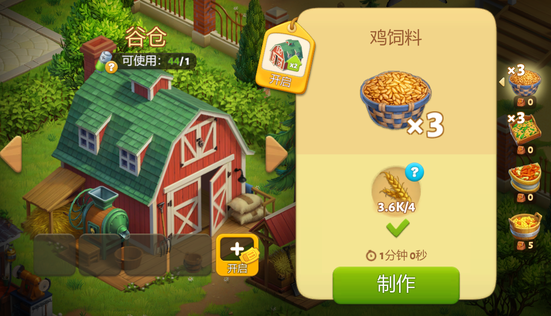 与任何建筑物一样,谷仓配备 2 个生产槽。您可以购买 2 个额外的插槽,总共 4 个。通过在各种配方之间上下滑动来选择您想要生产的配方。选择配方后,只需将其拖向建筑物或使用开始按钮即可。您需要拥有能够开始生产的原料。每道食谱所需的食材均显示在屏幕右侧。