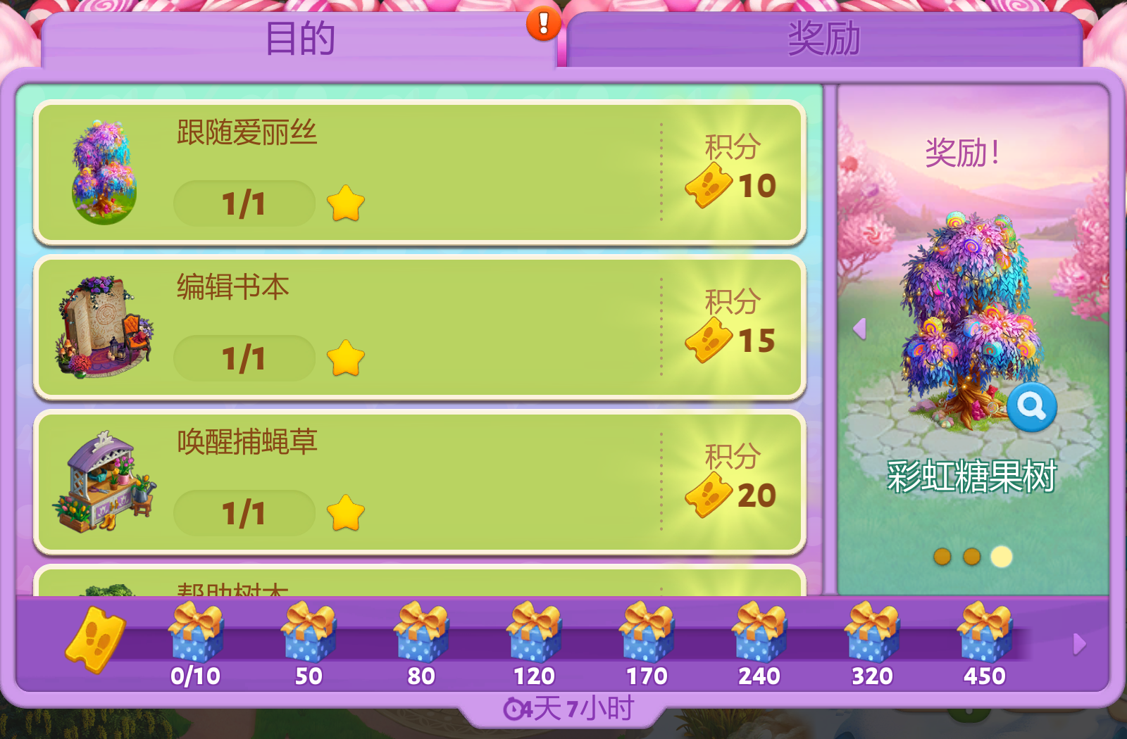目的是您需要收集指定数量的项目或执行一系列操作的长期任务。 奖励可能会有所不同,包括能量、硬币、助推器、额外饲料、炸药等。